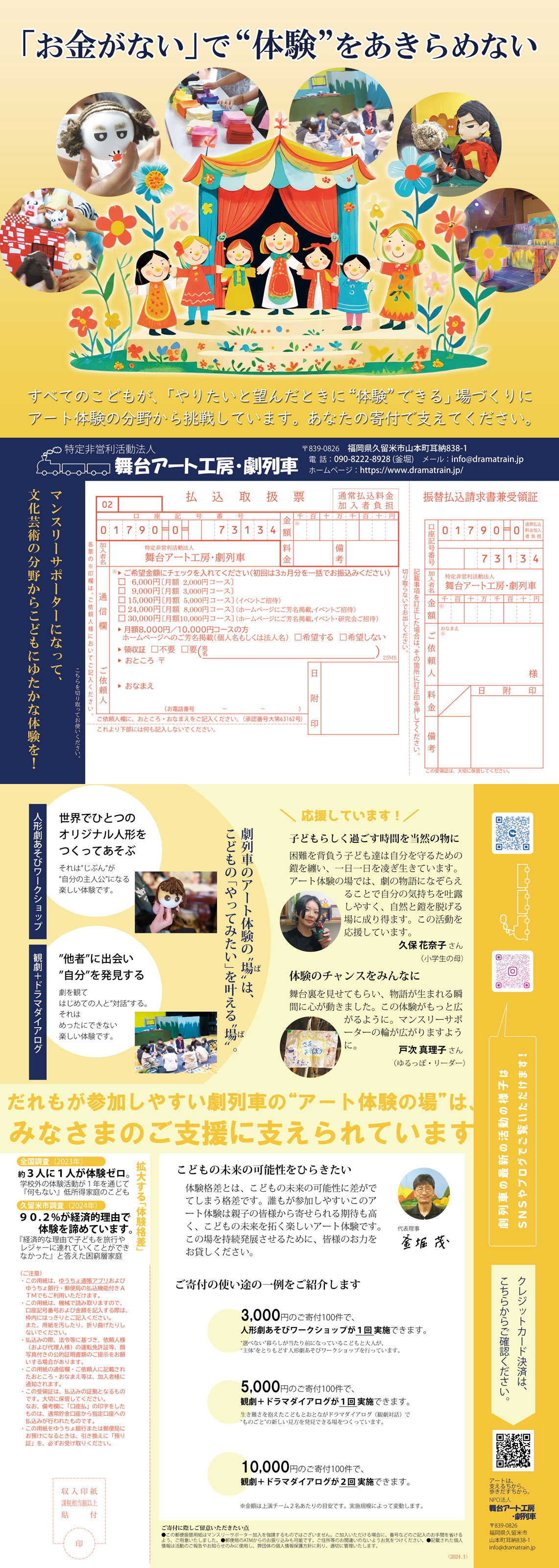 劇列車のミッション・ビジョンにご賛同くださる個人法人を問わず、ご支援をお待ちしています。事業を指定して寄付をすることも可能です。